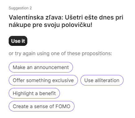 Neviete vymyslieť trefný predmet e-mailu? Nevadí. Stačí, keď v Brevo zadáte kľúčové slovo, napr. „valentínska zľava“ a AI vám vytvorí niekoľko slušných návrhov, ktoré môžete ďalej upravovať.